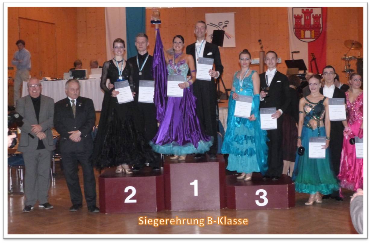 Am späten Nachmittag bot die B-Klasse den Höhepunkt der Tagesveranstaltung. Die Wertungsrichter Marion Dehling (Tanzakademie Berlin), Anke Haferkamp (ATC Freiberg), Thomas Leinhäupl (TSC Savoy München), Andreas Neuhaus (TTK Grün-Weiß Vegesack/Bremen) und Peter Schramm (TSG Da Capo Ebersberg) hatten den Wiener Walzer als dazukommenden fünften Tanz mitzubewerten und entschieden sich für Jonas Berberich/Karin Schuster (TC Rot-Gold Würzburg), die bereits ab dem ersten Tanz ganz klar zeigten, dass sie die diesjährigen Meister ihrer Klasse sind und alle fünf Tänze gewannen. Vizemeister wurden David Mieth/Teresa Zauner vom TSC Rondo im TSV Haar vor Pascal Schön/Irina Pecheritsa (TSC Rot-Gold-Casino Nürnberg).